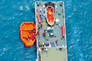 接到求救信號(hào)后,海上指揮所迅速派出各支救援分隊(duì)趕往事發(fā)海域。艦載救護(hù)直升機(jī)、海上傷員搜索定位裝置、拋射式救生索、救生吊桿、漂浮擔(dān)架、漂浮式救生網(wǎng)、救生浮臺(tái)、充氣滑梯等10多種新型海上醫(yī)療救護(hù)裝備紛紛亮相,大顯身手,上演了一幕幕扣人心弦的海上生命大救援。