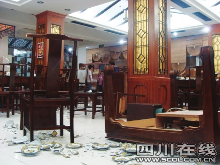 洪雅縣招商局局長(zhǎng)冷國(guó)民,帶著10余位親朋好友,也在該店“青衣江”包間內(nèi)用餐。飯后結(jié)賬時(shí),冷國(guó)民一行與收銀員在簽單上出現(xiàn)分歧,隨之發(fā)生口角。當(dāng)冷國(guó)民讓司機(jī)現(xiàn)金結(jié)清賬單后,其所帶男性客人在趕來(lái)“救場(chǎng)”的3名男子的帶領(lǐng)下,砸爛店內(nèi)桌椅、碗碟等,打傷兩名店員。