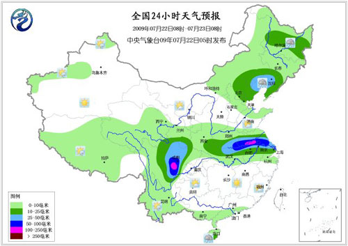 中新網(wǎng)7月22日電 中央氣象臺(tái)2009年7月22日06時(shí)發(fā)布未來三天天氣趨勢預(yù)報(bào)稱,江淮黃淮四川盆地江南北部等地有強(qiáng)降水,江南華南西南地區(qū)東部等地仍有高溫。