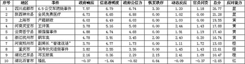 說明:本表數(shù)據(jù)為11位輿情分析師采用德爾菲法,對地方政府應(yīng)對網(wǎng)絡(luò)輿情表現(xiàn)進(jìn)行分項評估后得出。其中政府響應(yīng)、信息透明度、政府公信力三項為常規(guī)指標(biāo),分值區(qū)域分別為-10~10分;恢復(fù)秩序、動態(tài)反應(yīng)、官員問責(zé)三項為特殊指標(biāo),分值區(qū)域分別為-5~5分、-3~3分、-3~3分。輿情分析師依據(jù)以上各項指標(biāo)對政府表現(xiàn)分別做出評價,政府表現(xiàn)越出色、應(yīng)對越得體則得分越高,反之則得分越低。最終依據(jù)各項表現(xiàn)綜合所得總分,得出藍(lán)、黃、橙、紅四級警報級別,警報程度相應(yīng)由低到高。其中總分20.00分以上為藍(lán)色警報,政府應(yīng)對總體較為得體;總分15.00~19.99分為黃色警報,政府應(yīng)對有待進(jìn)一步加強(qiáng);總分10.00~14.99為橙色警報,政府應(yīng)對存在明顯問題;總分10.00分以下為紅色警報,政府應(yīng)對嚴(yán)重失當(dāng),存在重大缺陷。