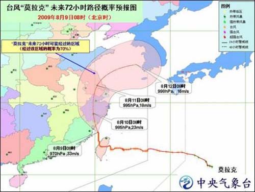 中新網(wǎng)8月9日電 據(jù)中國氣象局網(wǎng)站消息,中央氣象臺(tái)8月9日上午發(fā)布臺(tái)風(fēng)紅色緊急警報(bào):今年第8號(hào)臺(tái)風(fēng)“ 莫拉克 ” (MORAKOT )的中心今天上午8時(shí)位于福建省霞浦縣南偏東方大約90公里的海面上,就是北緯25.9度、東經(jīng)120.4度,中心附近最大風(fēng)力有12級(jí)(33 米 / 秒),中心最低氣壓970百帕 。