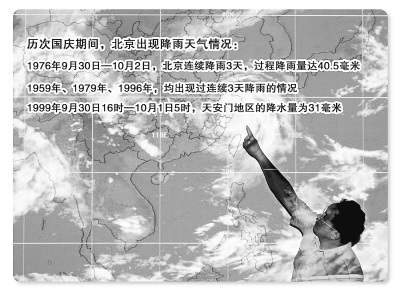 歷次國慶期間,北京曾經(jīng)出現(xiàn)過幾次大雨和連續(xù)性降雨:1976年9月30日—10月2日,北京連續(xù)降雨3天,過程降雨量達(dá)40.5毫米;1959年、1979年和1996年也出現(xiàn)過連續(xù)3天降雨的情況;1999年國慶50周年前夜,北京出現(xiàn)降雨,一直持續(xù)到10月1日早晨。9月30日16時到10月1日5時,天安門地區(qū)的降水量為31毫米,給國慶活動的前期準(zhǔn)備工作造成了影響。