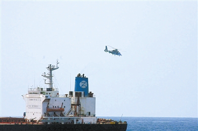 10時15分,“舟山”艦廣播里傳出命令:“直升機起降部署”。幾分鐘后,飛行甲板上鐵翼飛旋、馬達轟鳴,艦載直升機搭載著3名全副武裝的特戰(zhàn)隊員緊急起飛,向“嘉信”號商船疾速飛去,準(zhǔn)備驅(qū)離“疑似海盜船只”。1分鐘后,我方直升機在“嘉信”號上空懸停,3名海軍特戰(zhàn)隊員通過機降和滑降兩種方式迅速登船,為受“疑似目標(biāo)”威脅的商船提供隨船護衛(wèi)。(記者朱達、特約記者余子富)