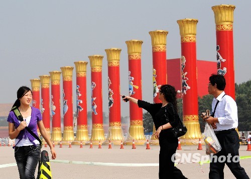 相關(guān)人士透露,民族團結(jié)柱作為六十周年國慶慶典的背景,在國慶過后將撤離出天安門廣場,可能供收藏,也可能會安放到中華民族園供游客觀賞。完