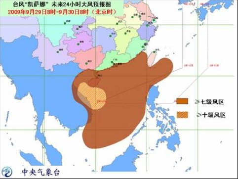 受“凱薩娜”及其外圍云系的影響,29日白天到夜間,南海大部海面、北部灣海面、瓊州海峽、海南沿海、廣西沿海將有7~9級(jí)大風(fēng),“凱薩娜”中心經(jīng)過(guò)的附近海面或地區(qū)的風(fēng)力將有10~13級(jí)大風(fēng),陣風(fēng)可達(dá)14~16級(jí);巴士海峽、巴林塘海峽、臺(tái)灣海峽、臺(tái)灣以東海面、廣東沿海、福建中南部沿海也將有6~7級(jí)大風(fēng),陣風(fēng)可達(dá)8~9級(jí);浙江東南部、福建東部、臺(tái)灣、廣東南部、海南等地有大雨或暴雨,海南南部的局部地區(qū)有大暴雨或特大暴雨。