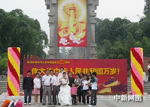 中新網(wǎng)成都10月1日電 (劉賢) 今日上午,成都浣花溪公園迎來了多對(duì)新人。他們有的身穿婚紗西服,有的則穿著傳統(tǒng)的紅色唐裝旗袍,紛紛在公園門前的“偉大的中華人民共和國(guó)”海報(bào)合影。這些新人表示,他們選擇在今天拍照,是因?yàn)榘炎鎳?guó)六十歲生日與結(jié)婚紀(jì)念日合為一天更有紀(jì)念意義。(完)