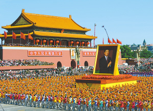 六十年前的“十一”,毛澤東在開國大典上向世界莊嚴(yán)宣告:“中華人民共和國,中央人民政府,今天成立了!”在新中國成立六十周年的慶典上,這聲音再次響徹天安門廣場。毛澤東巨幅畫像及“毛澤東思想萬歲”、“中國人民從此站起來了”兩句標(biāo)語,出現(xiàn)在游行方陣中,似乎將人們帶回到六十年前新中國開國大典的振奮時(shí)刻。