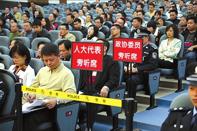 在一中院庭審現(xiàn)場,有20余名市人大代表和政協(xié)委員坐在旁聽席上,他們是專門受邀進(jìn)行現(xiàn)場監(jiān)督。據(jù)悉,起訴到各中院或上訴至市高院的重點(diǎn)“涉黑涉惡”案件的庭審均將邀請人大代表、政協(xié)委員現(xiàn)場監(jiān)督。