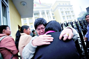 昨日,重慶“涉黑涉惡”系列案劉鐘永案開庭審理。庭外涉案人員家屬抱頭痛哭。記者 郭鐵流 攝