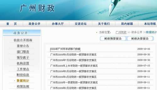 查詢方式為,登陸廣州財(cái)政網(wǎng)站()后,點(diǎn)擊打開(kāi)“政務(wù)公開(kāi)”欄目中的“數(shù)據(jù)統(tǒng)計(jì)”一欄(/zwgk/sjtj/index.htm),可以看到《2009年廣州市本級(jí)部門預(yù)算》的鏈接,打開(kāi)之后為一個(gè)簡(jiǎn)單的114個(gè)部門的索引列表。