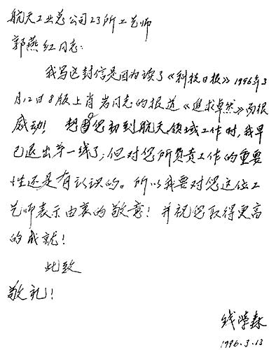 郭燕紅迫不及待地打開信。信中用藍(lán)墨水鋼筆工工整整寫道:“航天工業(yè)總公司23所工藝師郭燕紅同志:我寫這封信是因為讀了《科技日報》1996年3月12日8版上肖巖的報道《追求卓然》而很感動!想您初到航天領(lǐng)域工作時,我早已退出第一線了;但對您所負(fù)責(zé)工作的重要性還是有認(rèn)識的。所以我要對您這位工藝師表示由衷的敬意!并祝您取得更高的成就!錢學(xué)森”。