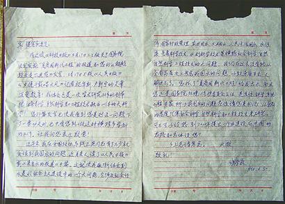 錢學(xué)森的這封親筆信共兩頁,圓珠筆書寫,落款時(shí)間是1996年6月30日,收信人是當(dāng)時(shí)的國務(wù)委員宋健。收藏此信的文敏女士告訴記者,這封信是自己3年前在北京舊書市場上購買到的,當(dāng)時(shí)一起買到的還有幾封名人信札。買回來后,起初也沒有很在意,但后來經(jīng)過閱讀,才覺出此信具有非常高的價(jià)值,便一直珍藏至今。從信中內(nèi)容得知,錢老不光研究航天科學(xué),對水的問題也很關(guān)心,并提出了很好的建議,而這方面以前很少有人提,F(xiàn)在,錢學(xué)森的去世讓所有中國人都感到惋惜和悲痛,這時(shí)把這封信公布出來,算是自己對老人表達(dá)的一份崇高敬意吧。