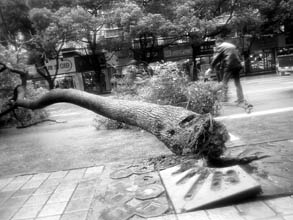 隨后,這棵樹(shù)迎風(fēng)墜地,樹(shù)根被連根拔起,發(fā)出巨大的砰響聲,周邊的地磚也被鑿裂。當(dāng)記者趕至現(xiàn)場(chǎng)時(shí)看到,這棵大樟樹(shù)直徑約有20公分,高約5米。