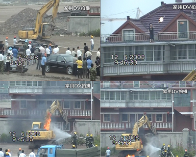 九點(diǎn),潘蓉家的大門被推土機(jī)鑿開(kāi),拆遷人員進(jìn)入樓內(nèi),要把潘蓉一家清除出樓房實(shí)施拆遷,但是由于潘蓉家里一二層用于出租,三四層還有一個(gè)防盜門,所以拆遷人員到了三層以后沒(méi)法上樓,雙方隔著門開(kāi)始叫喊,地面的人開(kāi)始向四樓扔石塊。氣氛也變得越來(lái)越緊張。9點(diǎn)15分,挖土機(jī)開(kāi)始鑿房屋的外墻,樓下的陽(yáng)臺(tái)被機(jī)器手拍斷,部分墻壁開(kāi)裂并且傾斜。
