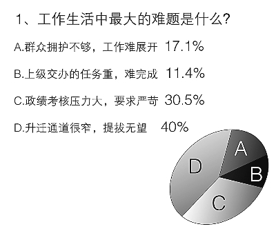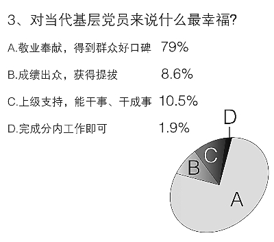 對(duì)當(dāng)代基層黨員干部來(lái)說(shuō),在事業(yè)上什么是最幸福的?根據(jù)調(diào)查,79%的受訪者選擇了“敬業(yè)奉獻(xiàn),得到群眾好口碑”,這說(shuō)明在基層,群眾工作是最重要的方面。也有10.5%的干部更希望得到“上級(jí)支持,有一個(gè)‘能干事,干成事’的氛圍”。