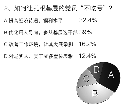 基層比較艱苦,基層比較復(fù)雜,被問(wèn)到“如何讓扎根基層的共產(chǎn)黨員‘吃苦不吃虧’?”時(shí),39%的受訪者更關(guān)注用人導(dǎo)向問(wèn)題,他們認(rèn)為應(yīng)該優(yōu)化用人導(dǎo)向,多從基層選拔領(lǐng)導(dǎo)干部;選擇提高經(jīng)濟(jì)待遇,福利水平的也占到了32.4%;值得注意的是,“更重視基層,改善工作環(huán)境,讓其大展拳腳”也受到關(guān)注,有16.2%的受訪者選擇了該選項(xiàng)。