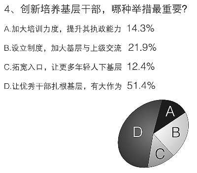 當(dāng)被問(wèn)到如何創(chuàng)新基層干部培養(yǎng)方式時(shí),51.4%的受訪者選擇了“讓優(yōu)秀干部安心扎根基層,有大作為”,這說(shuō)明基層雖苦,但在基層干部眼中卻是鍛煉干部最好的大學(xué)校,另外也表明了目前基層缺人才的現(xiàn)狀,熱切呼喚德才兼?zhèn)涞摹澳苋恕比ヮI(lǐng)導(dǎo)和管理。要解決這個(gè)問(wèn)題,有21.9%的受訪者認(rèn)為應(yīng)該設(shè)立制度,加大基層與上級(jí)干部間交流。同時(shí),12.4%的黨員干部把“拓寬入口,讓更多年輕人下基層”當(dāng)作創(chuàng)新基層干部培養(yǎng)的首選。(梁昌杰、王慧)