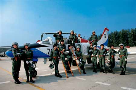 這個(gè)英雄群體共有16名殲擊機(jī)女飛行員,分別來自陜西、遼寧、河北、山東、山西、四川、江蘇、浙江、湖北9個(gè)省,最大24歲,最小22歲,是空軍2005年招收的第8批女飛行學(xué)員中的佼佼者。4年來,她們輾轉(zhuǎn)航空大學(xué)、兩所飛行學(xué)院,歷經(jīng)基礎(chǔ)教育、初教機(jī)訓(xùn)練、高教機(jī)訓(xùn)練3個(gè)階段,實(shí)現(xiàn)了從一名高中生到軍人再到女飛行員的人生飛躍。她們用堅(jiān)韌、智慧克服了常人難以想象的困難,從仰望藍(lán)天到擁抱藍(lán)天并最終融入藍(lán)天。在她們身上,既承載著中國(guó)軍人的共同使命,也閃爍著自己特有的光芒。