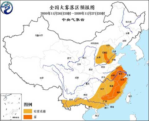 中央氣象臺(tái)2009年11月26日18時(shí)繼續(xù)發(fā)布大霧橙色警報(bào):