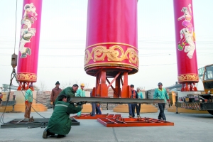 民族團(tuán)結(jié)柱的生產(chǎn)和安裝都由住總鋼結(jié)構(gòu)公司負(fù)責(zé)。昨日下午,東四環(huán)外窯洼湖橋附近的住總鋼結(jié)構(gòu)公司廠區(qū)內(nèi),一條較寬的道路兩旁已經(jīng)豎立起了30多根民族團(tuán)結(jié)柱,還有一些民族團(tuán)結(jié)柱正從運(yùn)輸車上卸下安裝。