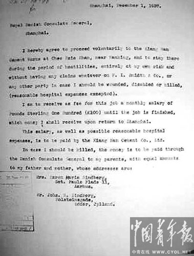 在丹麥,記者收集到的史料還包括:1938年2月7日,F.L.史密斯上海公司女秘書史丹倫致辛德貝格的信;1938年5月21日、6月9日,就日商調(diào)查中方工廠底細(xì),F(xiàn).L.史密斯公司人員分別從香港、東京致江南水泥廠,標(biāo)明“保密件”或囑“不要讓別人知道”等字樣的函;1938年6月初,辛德貝格在日內(nèi)瓦披露了南京大屠殺真相后準(zhǔn)備移民美國,他于7月4日離開奧胡斯時的答記者問,等等。
