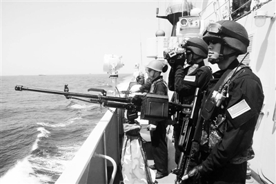 在演練籌備階段,曾出現(xiàn)一則耐人尋味的花絮:為檢驗(yàn)被護(hù)商船的警惕性,編隊(duì)指揮所在不事先通知的情況下,特意安排特戰(zhàn)隊(duì)員乘小艇向一艘商船秘密靠近,結(jié)果該商船很快發(fā)現(xiàn)情況,向編隊(duì)求救并在第一時(shí)間向友鄰商船通報(bào)。編隊(duì)指揮員王志國(guó)作出指示:“要將反海盜的防護(hù)網(wǎng)絡(luò)向被護(hù)商船末端延伸,通過(guò)軍地?cái)y手共同打造一體化安全防護(hù)平臺(tái)!