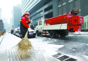 昨天凌晨飄落2010年第一場(chǎng)雪。從凌晨3時(shí)起,全市動(dòng)員了兩萬(wàn)名環(huán)衛(wèi)工人,連夜掃除積雪、施撒融雪劑,市區(qū)主要道路沒(méi)有因積雪而擁堵,全市交通暢通,市民出行無(wú)憂。
