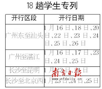 記者昨日從廣鐵集團有關(guān)部門獲悉,從1月16日起至26日,廣鐵集團將開行18趟學(xué)生專列,并采取多項舉措方便學(xué)生購票。