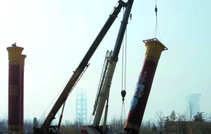 10點(diǎn)半,吊車首先將民族柱的水泥墩安放在鋼板上,然后將柱體吊起,對(duì)接在水泥墩上,并進(jìn)行固定,將民族柱的冠頂安裝在柱體上。每根民族柱安裝約20多分鐘。