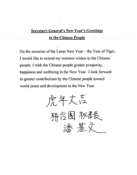 潘基文在用英文發(fā)表的賀詞中說:“值此農(nóng)歷新年‘虎年’到來之際,我謹(jǐn)向中國人民致以最熱烈的祝賀。祝愿中國人民在新的一年里更加幸福安康。我期待著中國人民在新的一年里為世界和平與發(fā)展作出更大貢獻(xiàn)。”