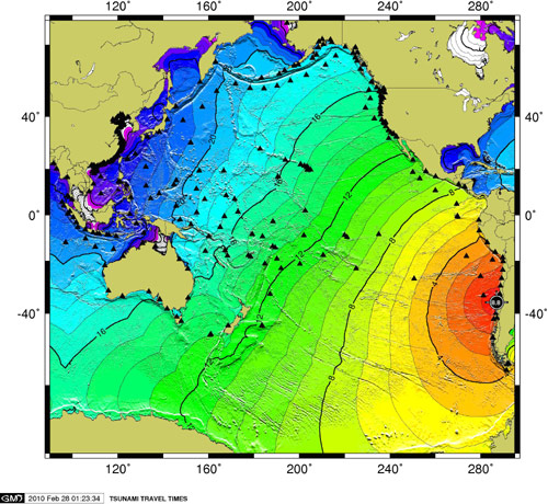隨著震級(jí)的修正,國(guó)家海洋環(huán)境預(yù)報(bào)中心又于16時(shí)15分發(fā)布了第二份海嘯信息。27日晚間,國(guó)家海洋局領(lǐng)導(dǎo)又連夜召開(kāi)緊急會(huì)議,指示有關(guān)部門與太平洋海嘯警報(bào)中心保持緊密聯(lián)系,對(duì)智利地震給太平洋沿岸國(guó)家造成的影響情況進(jìn)行全面分析,提醒國(guó)內(nèi)有關(guān)部門和我駐外機(jī)構(gòu)及時(shí)采取有效措施,避免海嘯災(zāi)害造成的損失。