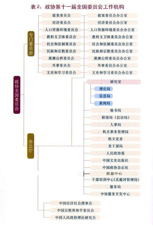 全國委員會設辦公廳,在秘書長領導下進行工作;設副秘書長若干人,協(xié)助秘書長進行工作。政協(xié)第十一屆全國委員會工作機構如表2。