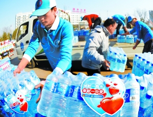 記者注意到,許多市民都是一家三口一起來捐水捐款,還有的是早晨聽到消息后現(xiàn)到超市買水趕來捐贈,一些晨練和路過的市民也自發(fā)加入了捐贈的隊伍。市民劉令珍夫婦帶著還在上小學(xué)的女兒馬小丫來到捐贈處,一家人捐了一箱水后,小丫又把100元錢交到工作人員手中。劉令珍告訴記者,自己家里也不寬裕,是低保戶,可孩子知道災(zāi)區(qū)的事后,就催著他們來捐水,自己還從壓歲錢里拿出100元,說災(zāi)區(qū)的小朋友們太渴了,用這錢給他們買水喝吧。