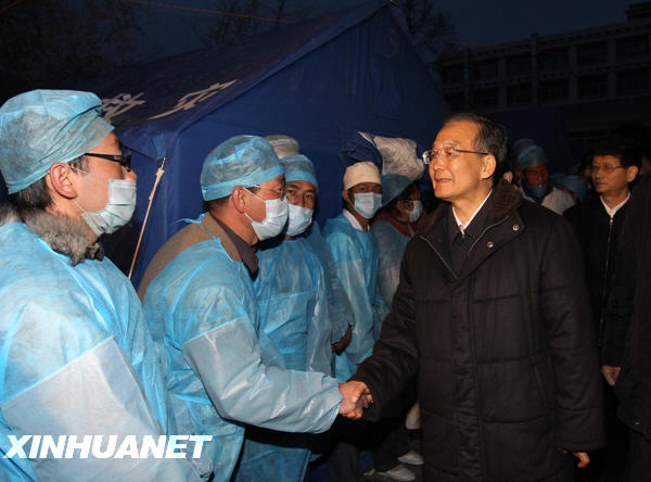 晚上8點40分,溫家寶在國務院抗震救災總指揮部的臨時帳篷里主持召開會議,聽取玉樹抗震救災情況的匯報并作了重要指示。會議結束時已經(jīng)過了23時,溫家寶又步行道體育場群眾安置點看望群眾。