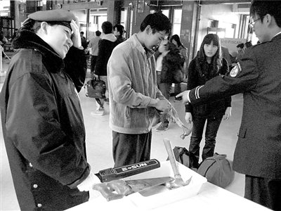 記者21日獲悉,為確保上海世博會安全,北京鐵路警方根據(jù)鐵道部、公安部日前聯(lián)合發(fā)出的通知,從即日起至11月15日,將對登車旅客隨身攜帶的物品以及通過鐵路托運的行包進行特別安檢。據(jù)了解,旅客不得隨身攜帶上車的物品除了管制刀具以外,餐刀、大型水果刀、剪刀、錘子等利器和鈍器也在禁帶之列。