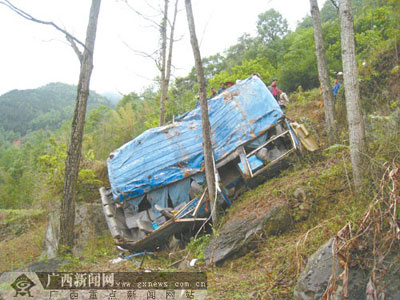 東蘭訊 4月22日上午9時許,一輛由大化瑤族自治縣七百弄鄉(xiāng)開往河池市的客運中巴車,在途經(jīng)東蘭縣花香鄉(xiāng)干來村時突發(fā)機械故障,導致車輛滾下90米長陡坡(垂直高度40米)。事故造成車上7名乘客先后死亡,35人不同程度受傷。