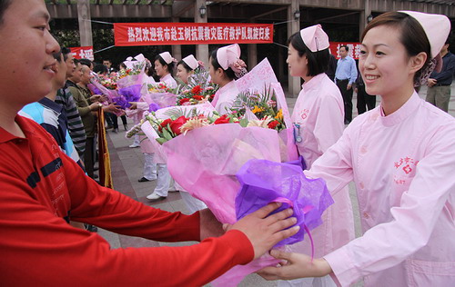 中新網(wǎng)成都4月30日電(蘭鋒)30日下午6時許,四川宜賓高速北站口,家鄉(xiāng)人民用鮮花和最熱烈的掌聲,歡迎圓滿完成青海玉樹抗震救災(zāi)任務(wù)的宜賓醫(yī)療救護隊凱旋。