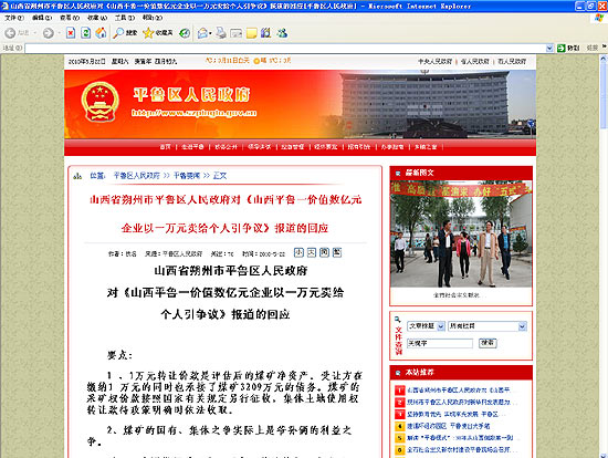 山西省朔州市平魯區(qū)人民政府對《山西平魯一價值數(shù)億元企業(yè)以一萬元賣給個人引爭議》報道的回應(yīng)