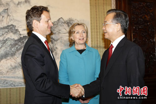 中新網(wǎng)北京5月25日電 (記者 張朔)中國(guó)總理溫家寶25日下午在中南海紫光閣會(huì)見(jiàn)來(lái)華出席第二輪中美戰(zhàn)略與經(jīng)濟(jì)對(duì)話的美國(guó)國(guó)務(wù)卿克林頓和財(cái)長(zhǎng)蓋特納。