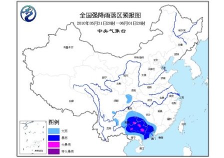 中新網(wǎng)5月31日電 中央氣象臺今日18時發(fā)布暴雨藍(lán)色預(yù)警:預(yù)計5月31日20時到6月1日20時,貴州中東部和南部、湖南西南部、廣西中北部、廣東中西部等地有大到暴雨,其中貴州東南部、廣西中北部等地的局部地區(qū)有大暴雨;上述部分地區(qū)還將伴有短時雷雨大風(fēng)等強對流天氣。另外,四川盆地東北部、云南東北部等地的部分地區(qū)有大雨。