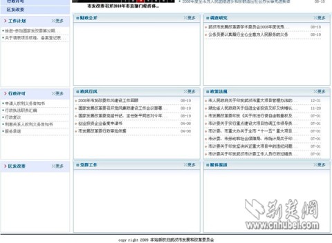 記者隨即登錄武漢市發(fā)改委政務(wù)公開網(wǎng)站。在該網(wǎng)站首頁記者發(fā)現(xiàn),除“來信選登”一欄開天窗以外,其它欄目的信息更新還比較及時(shí)。可當(dāng)記者點(diǎn)擊進(jìn)入子欄目時(shí),就不是那么回事了!俺R妴栴}匯總”、“表格下載”、“項(xiàng)目稽查”、“財(cái)政公開”等十幾個(gè)子欄目,均無任何內(nèi)容,只有大片空白。此外,在市民具體辦事的“業(yè)務(wù)專欄”欄目下,24個(gè)子欄目內(nèi)容驚人地一致,幾乎全是空白框架。