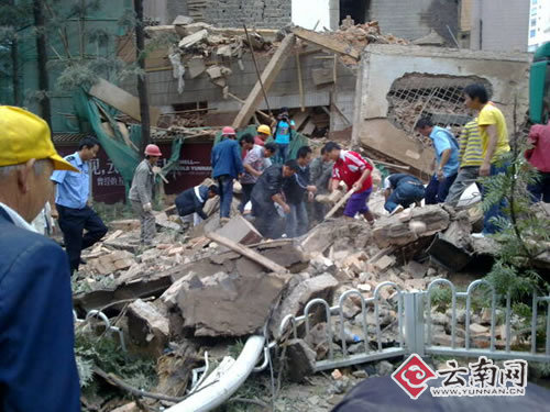 記者現(xiàn)場(chǎng)了解到,今天上午11時(shí)15分左右,云南飯店在拆遷過程中突然發(fā)生倒塌?繓|風(fēng)西路一邊正在被拆遷的一堵高大約7米的墻體砸向公交站臺(tái),一輛5路公交車正在站臺(tái)上下客,由于墻體離公交站臺(tái)非常近,正在下車的兩名乘客(一男一女)被砸傷。隨后,救護(hù)車迅速趕往現(xiàn)場(chǎng),目前,兩名傷者均已被送往醫(yī)院搶救,傷勢(shì)尚不清楚。
