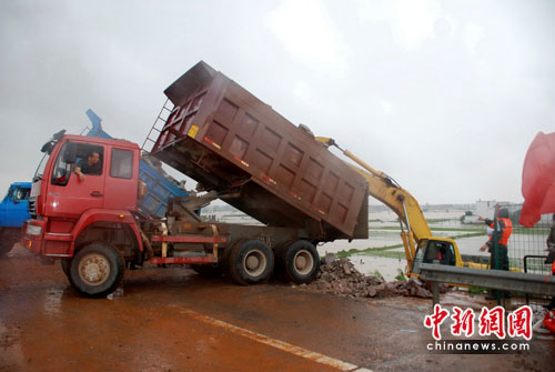 中新網(wǎng)臨川6月24日電(張見(jiàn)悅 劉占昆 何柳斌)江西撫河唱?jiǎng)P段數(shù)百米米決口封堵方案已經(jīng)確定,24日中午,記者在福銀高速撫河大橋看到,大批工程車(chē)輛運(yùn)載石料,準(zhǔn)備鋪就一條運(yùn)輸通道延伸向決口初,決口封堵的外圍工程在雨中開(kāi)始緊張進(jìn)行。