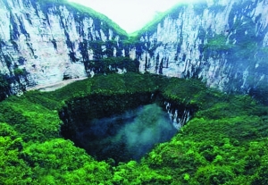 天坑 2001年之前,通常指重慶奉節(jié)縣的小寨天坑(上圖)。2005年后,這個(gè)中國人定義的術(shù)語獲得國際喀斯特學(xué)術(shù)界認(rèn)可,以“tiankeng”通行國際。