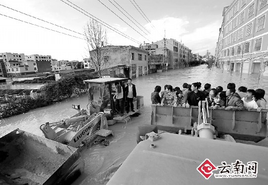 昨晚7點左右,孔垂柱到達(dá)馬龍縣城考察災(zāi)情,剛到老城區(qū)口,看到來來往往運(yùn)送災(zāi)民的裝載機(jī),孔垂柱立即攀上了其中一輛,拉穩(wěn)之后,站在了裝載機(jī)駕駛室外的踏板上往城內(nèi)進(jìn)發(fā)。記者也爬上這輛特殊的“視察車”,一起進(jìn)入城區(qū),目睹了馬龍老城被水淹的慘景。
