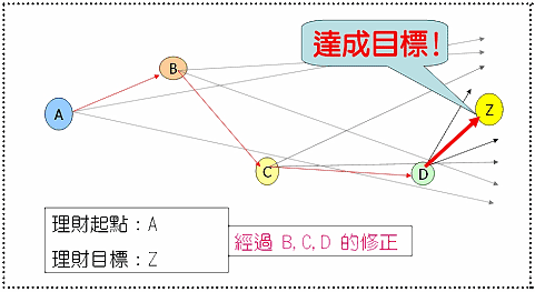 經(jīng)過(guò)一段時(shí)間,理財(cái)階段來(lái)到了C點(diǎn),似乎又偏離了當(dāng)初既定的方向。就又是“適時(shí)調(diào)整”的時(shí)候,所以重新找出新方向,即從C點(diǎn)至Z點(diǎn)的雙箭頭所涵蓋的范圍。在投資理財(cái)?shù)倪^(guò)程中,會(huì)不斷的重復(fù)B點(diǎn)、C點(diǎn)、D點(diǎn)等的修訂調(diào)整。