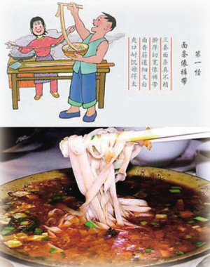 中國人吃面講究很多,實質(zhì)是把“人之常情”,“世間常理”物化在面條中。過生日吃長壽面;娶媳婦、喬遷新居要吃打鹵面,有湯有面有滋有味;農(nóng)歷二月二“龍?zhí)ь^”祈盼風(fēng)調(diào)雨順吃龍須面。不同時節(jié),不同的喜慶節(jié)日吃不同的面條。