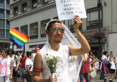 亞裔隊(duì)伍由巨大的彩虹字幅“Asian Pride”打頭陣,數(shù)十人演奏亞洲樂器,吸引民眾注意力,緊隨其后的是專門為亞裔女同志設(shè)立的Q-Wave團(tuán)體!皝喬岚滩÷(lián)盟”(APICHA)主打“免費(fèi)HIV檢測(cè)”計(jì)劃,近百位身穿紅色T恤的成員們手舉標(biāo)語,向沿路民眾分發(fā)安全套。很多亞裔同志勇敢展示自己,其中不乏華裔身影。一位身穿結(jié)婚禮服的亞裔男同志,手舉“要求紐約承認(rèn)同性婚姻”的牌子,表達(dá)了同志們的呼聲。也有不少同志的支持者參加游行,梁淑儀支持身為女同志的姐姐梁淑安一起來游行,當(dāng)義工的劉健行和劉素夫婦表示有很多同志朋友,大家都是一樣的人,沒有什么不同。(劉爽)
