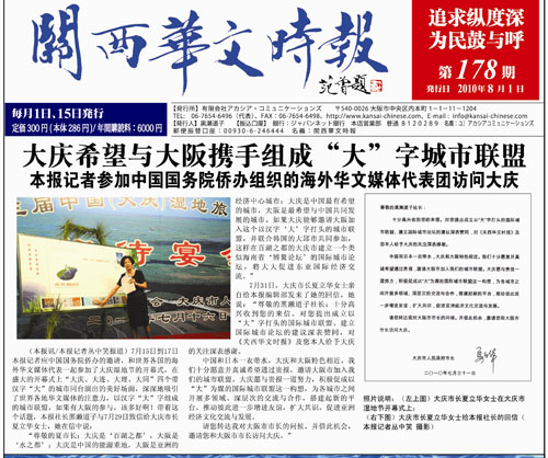7月31日,大慶市長夏立華女士親自給日本《關(guān)西華文時報》編輯部發(fā)來了她的回信,她說:“尊敬的黑瀨道子社長:十分高興收到您的來信。對您提出成立以“大”字打頭的國際城市聯(lián)盟、建立國際城市論壇的建議深表贊同,對《關(guān)西華文時報》及您本人給予大慶的關(guān)注深表感謝。中國和日本一衣帶水,大慶和大阪特色相近。我們十分愿意并真誠希望通過貴報,邀請大阪市加入我們的城市聯(lián)盟。大慶愿與貴報一道努力,積極促成以“大”為媒的國際城市聯(lián)盟這一構(gòu)想,為各城市之間開展多領(lǐng)域、深層次的交流與合作,搭建起新的平臺,推動彼此進(jìn)一步增進(jìn)友誼,擴(kuò)大共識,促進(jìn)亞洲經(jīng)濟(jì)文化交流與發(fā)展。請您轉(zhuǎn)達(dá)我對大阪市市長的問候。并借此機會,邀請您和大阪市市長訪問大慶。”(渡邊)