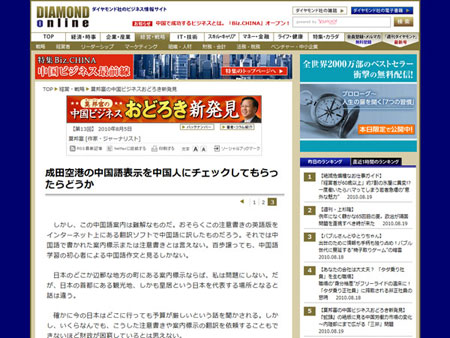 中新網(wǎng)8月20日電 據(jù)日本新華僑報網(wǎng)報道,今年7月1日,日本開始在此降低中國個人游入境門檻。顯然,日本民主黨執(zhí)政上臺后把“觀光立國”作為一個基本國策。但是,要迎接大量中國游客的到來,日本真的準(zhǔn)備好了嗎?近日,著名旅日華人作家莫邦富在日本主要經(jīng)濟周刊《鉆石》網(wǎng)站上連續(xù)撰文,指出日本的“國門”成田機場里,面向中國游客的一些中文標(biāo)識的翻譯十分粗糙,有些服務(wù)細(xì)節(jié)不如中國,工作人員在意識上還沒有完全做好接待中國游客的準(zhǔn)備。